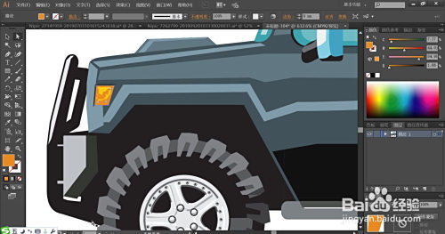 越野车的后车厢外的备胎利用蓝灰色、灰白色搭配填充,车架利用黑色填充。后车灯利用橙色与红色搭配黑色填充。