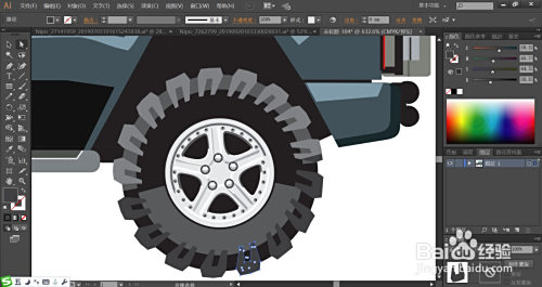 车轮利用明暗蓝灰色别离填充车轮的外部上方与下方,下方的蓝灰色的色调更暗一些。车轮的中心利用黑色填充,车轮的内部利用灰白色搭配蓝灰色与白色填充本家儿体与凹凸处的暗影结果路径填充。