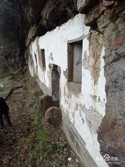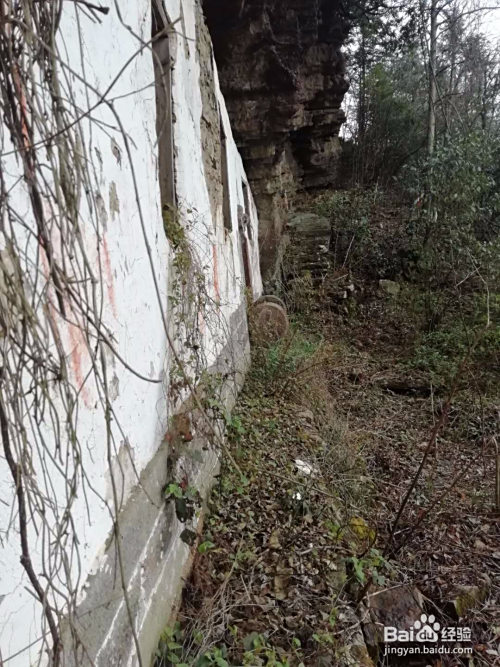 沿雷打庙后的山脊下行约一百米,顺着山边石壁上的巷子,拐入一道巨崖 。远了望见巨崖里面有一堵白粉墙,那就是岩屋庙!