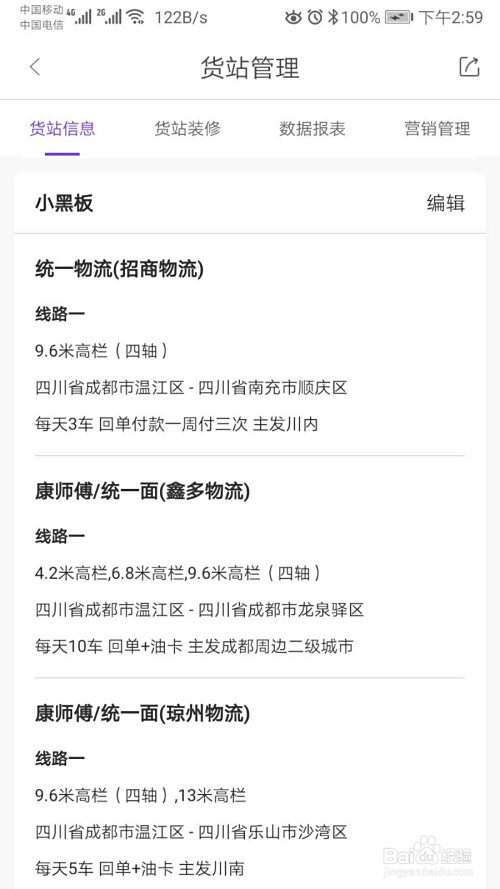 选择顶部【店肆信息】,编纂小黑板,完美项目及线路;项目要多,内容要全,司机都喜好货源不变、订单丰硕的合作伙伴。项目都发到货站,才能吸引分歧车型、分歧线路的司机签约。