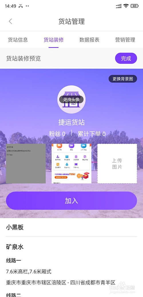 选择顶部【货站装修】,改换头像、布景图并上传图片,图片尽量上传实体公司情况;