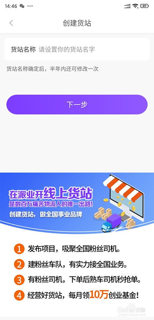 进入首页点击【货站办理】,编纂货站名称。货站名称尽量简单好记,若有实体公司以公司名定名;