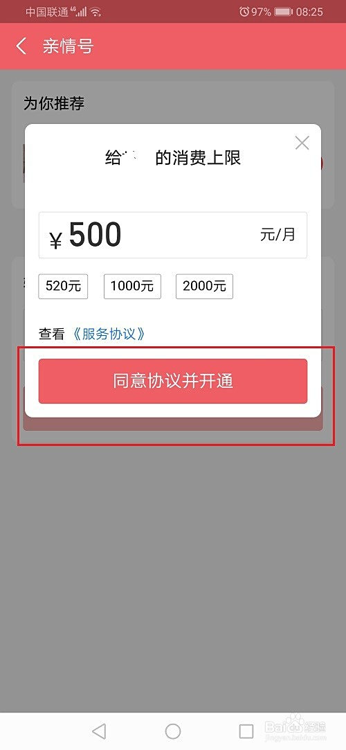 第五步设置每月消费上限,点击赞成和谈并开通就完当作了,如下图所示: