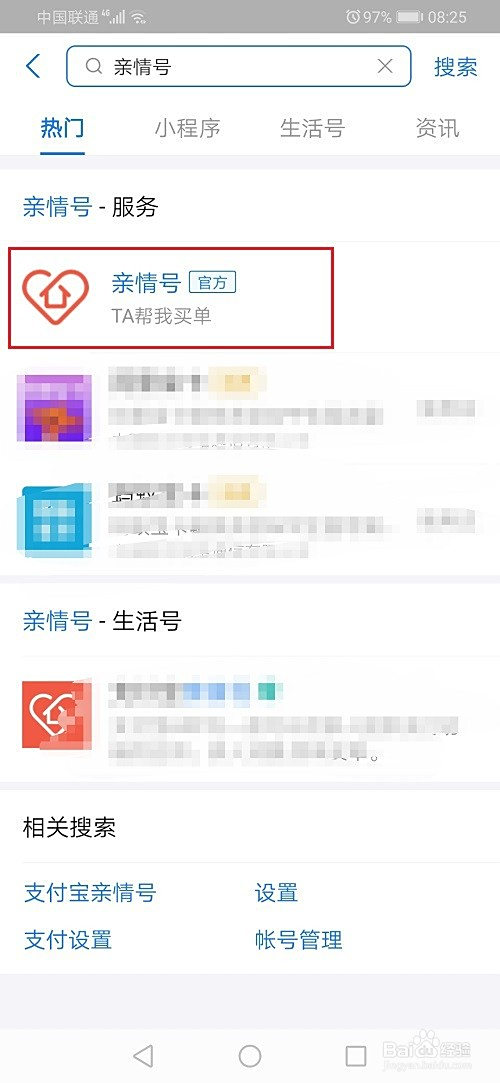 第一步打开支付宝,进去首页之后,搜刮亲情号,如下图所示: