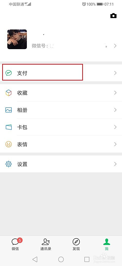 第一步打开微信,进去我的界面,点击支付,如下图所示: