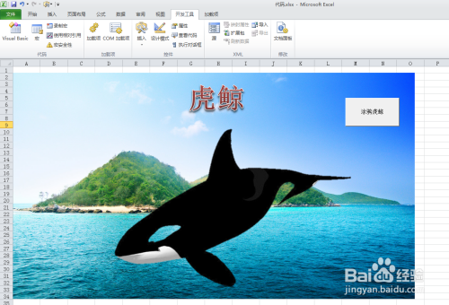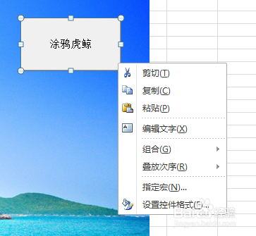 7.将按钮控件定名为“涂鸦虎鲸”,然后点击右键,选择“指定宏”选项。