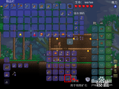 熔炉建造要求:岩石块×20,木材×4、火炬×3。