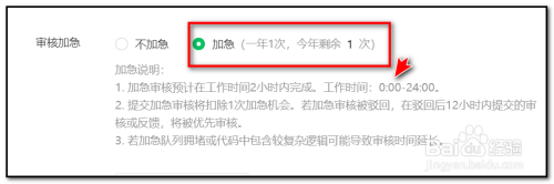 4.审核中选择“加急”可以加速人工审核,不外一年只能用一次且必需合适要求
