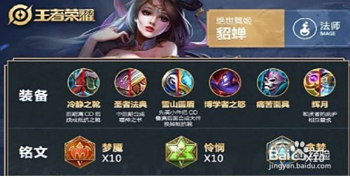貂蝉,法刺英雄,拥有矫捷的位移及高额的危险,兵士克星,出装铭文见下图;