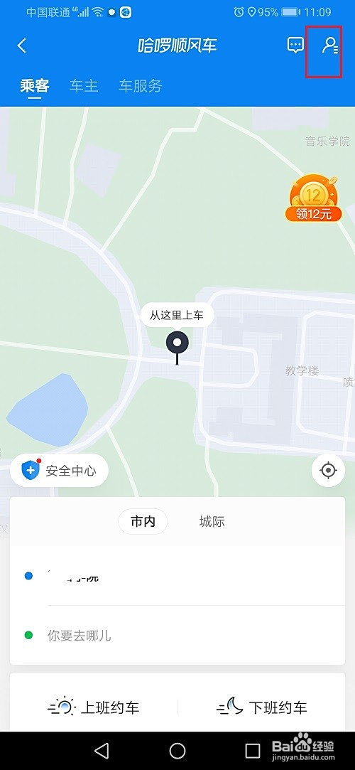 第三步进去哈啰顺风车之后,点击右上方的人像图标,如下图所示: