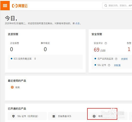 在节制台首页,点击【已开通的云产物】->【域名】,进入域名节制台。