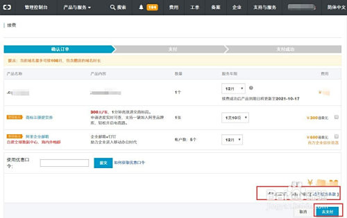 在确认订单页面,核实域名信息,勾选域名办事条条目,点击【去支付】按钮,进入支付页面。
