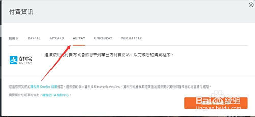 这时辰就会跳出一个付条目的对话框,选择‘ALIPAY’就是支付宝支付,然后点击右下角的继续。
