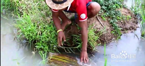 放在水底之后,用石头压住,一般水里有鱼的话其实四个小时摆布可以去看看有没有收成。