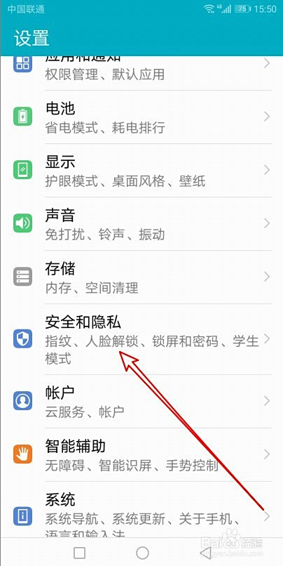 在打开的华为手机设置页面,点击平安和隐私的菜单。
