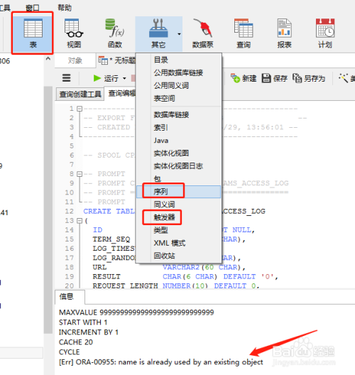 3、对于存在的序列、表、触发器,可进入下方位置进行删除
