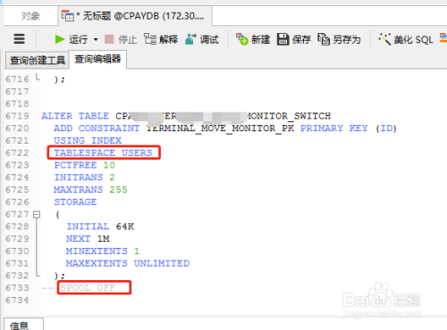 2、对SQL语句中 TABLESPACE 表空间要确认是否存在,不存在则建立或替代当作存在的表空间名称。