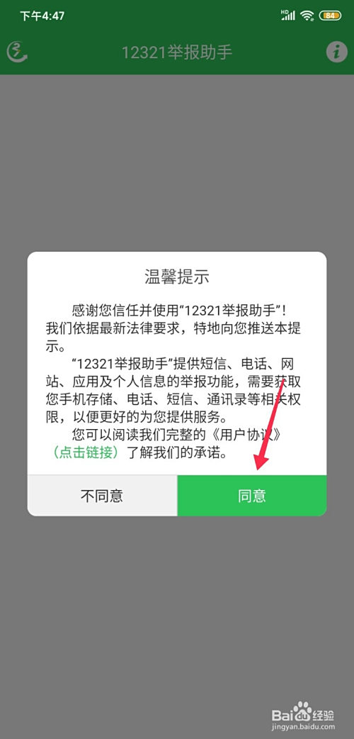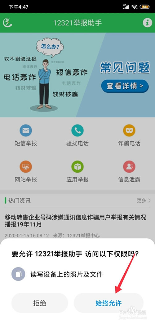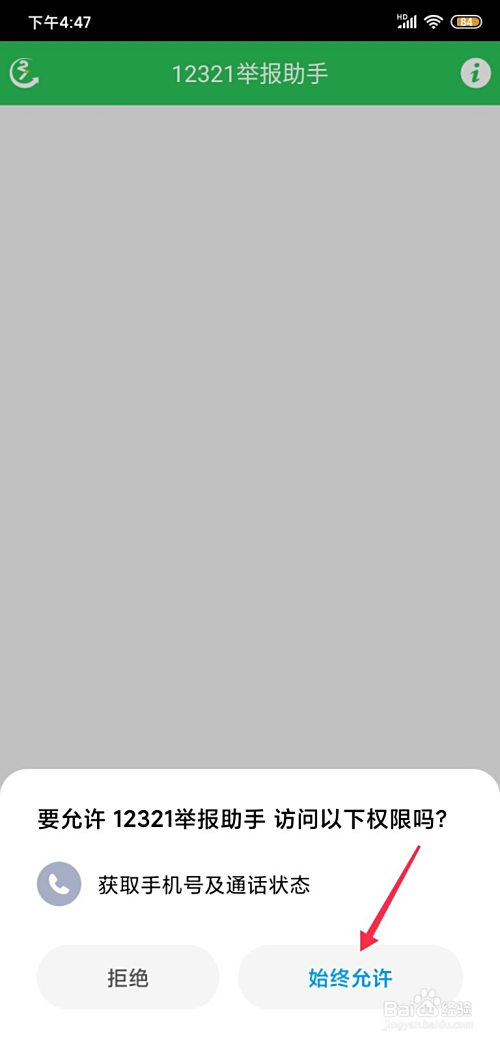 1.手机应用商铺或浏览器内下载12321举报助手后打开,许可获取手机权限;