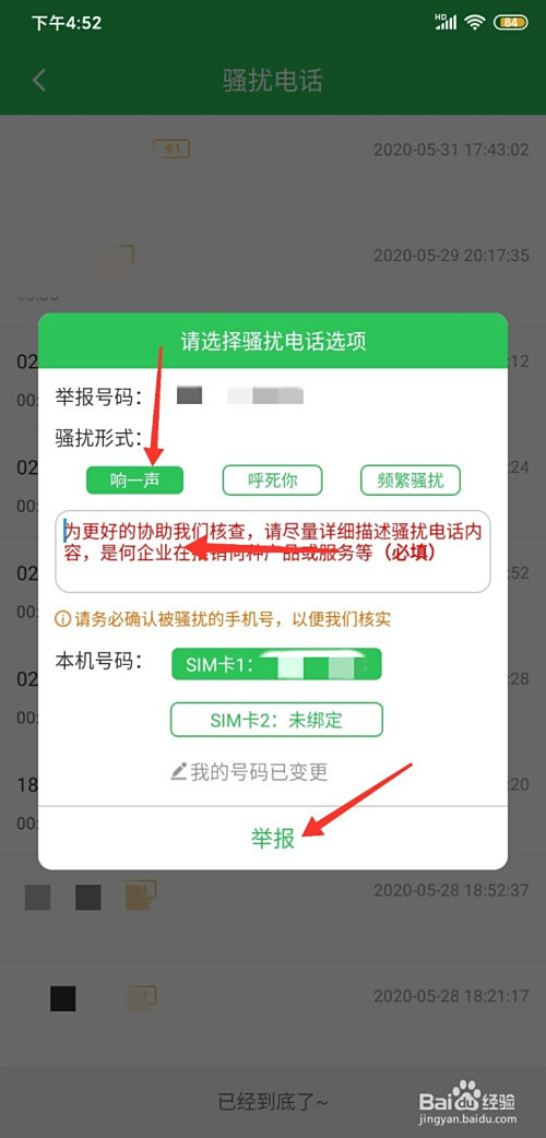 3.完美本身的手机号信息后返回德律风列表并点击,选择骚扰形式和填写骚扰内容后点击举报即可。