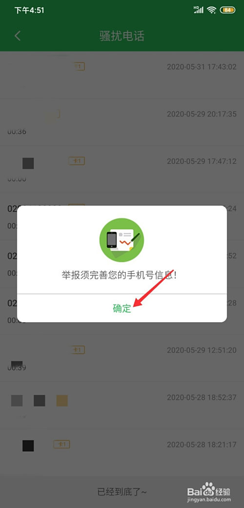 选摘要举报的德律风并点击,在弹出的窗口点击“确定”;