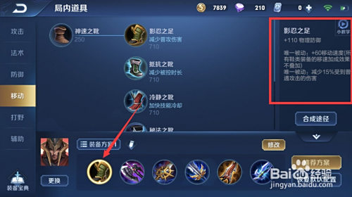 接下来,第一件装备出“影忍之足”因为蒙恬蓄力普攻是霸体所以不消出抵当之靴,布甲鞋可以提高坦度,