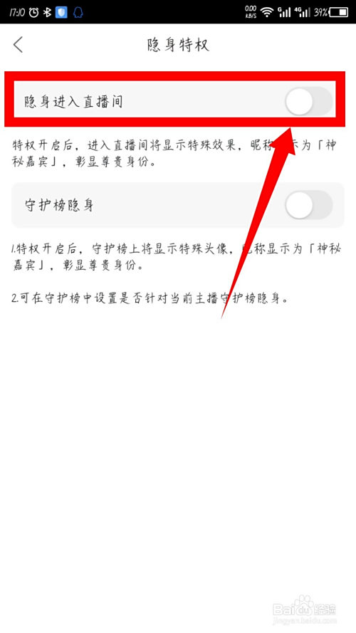 能看到隐身进入直播间选项,灰色选项是封闭,点击滑块开启。