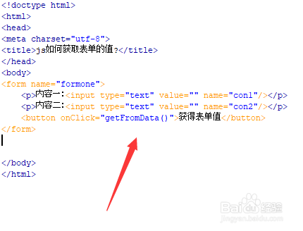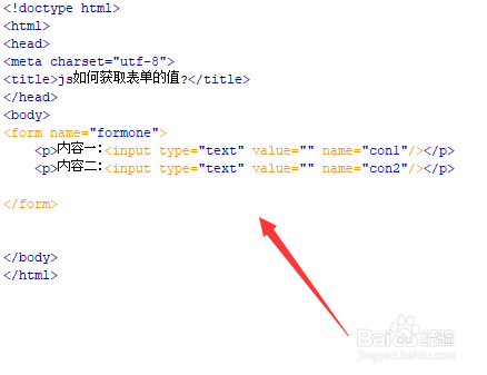2、设置form标签的name属性值为formone,两个input框的name属性别离为con1,con2。