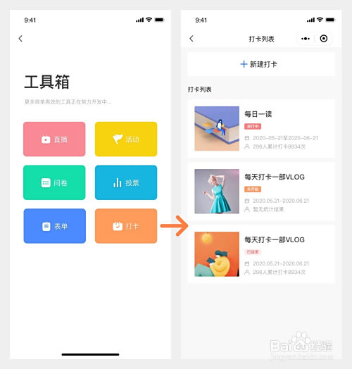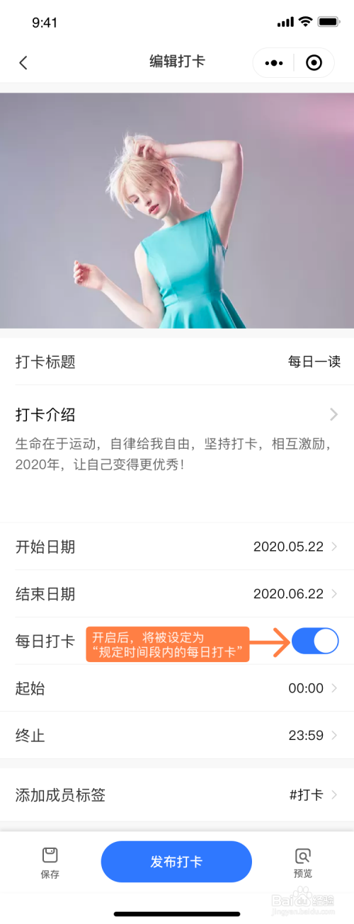 点击上方的「新建打卡」选项,进入设置装备摆设页,可在设置装备摆设页中填写相关内容,包罗打卡的题目、介绍、打卡起头时候、竣事时候、打卡的时候段设置、当作员标签等,可按照现实环境进行相关的设置装备摆设。