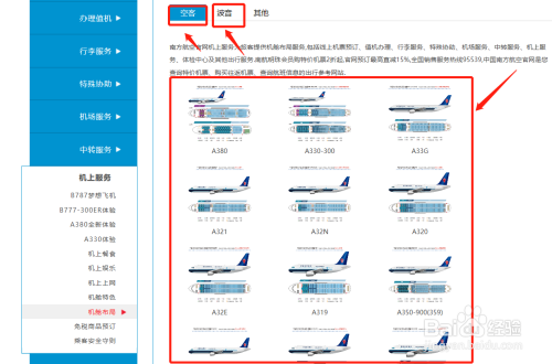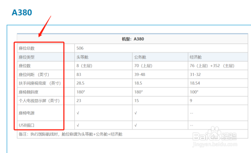 可以查看该机型的座位总数、座位类型、座位数、座位间距、扶手间座椅宽度、座椅倾斜度、小我电视显示屏、座椅电源、USB插口等配备。