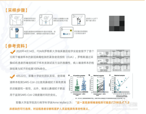 2020年4月14日,首个可以用于新冠检测的唾液样本紧急使用权(EUA)被FDA授予了罗格斯大学临床基因组学实验室。罗格斯通过采集60名冠状病毒患者的唾液和拭子样本来测试该方法的准确性。经过实验证明,冠状病毒患者的唾液样本与拭子的样本结果吻合度为100%4月22日,耶鲁大学研究团队发现,针对COVID-19,唾液样本检测的灵敏度和一致性高于鼻咽拭子,并且,相比于咽拭子,唾液更适用于监测COVID-19滴度随时间的变化。来自耶鲁大学医学院的流行病学家Anne Wyille表示:这一实验可以表明唾液检测是识别