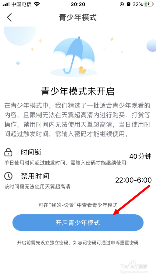 然后会进入【青少年模式】的设置页面,点击【开启青少年模式】。