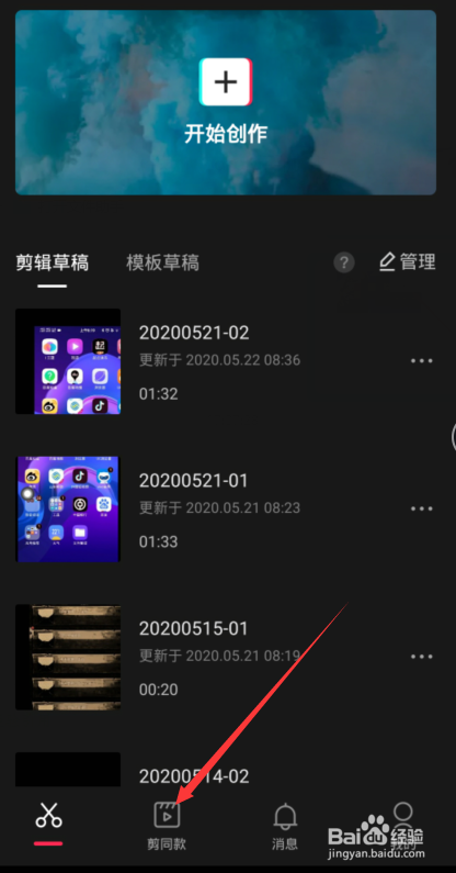 第一:手机打开剪映客户端点击下方的剪同条目选项。
