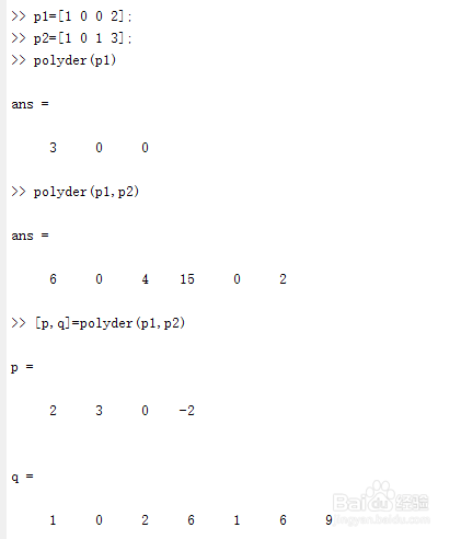 p=polyder(p1,p2),求多项式p1*p2的积的导数;