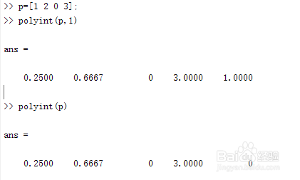 I=polyint(p),求以p为系数的多项式的积分,积分常数默认为0。