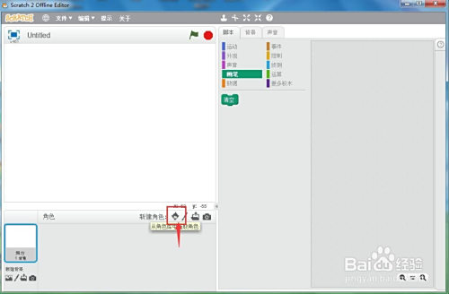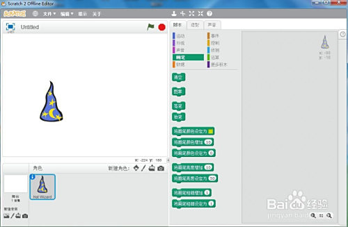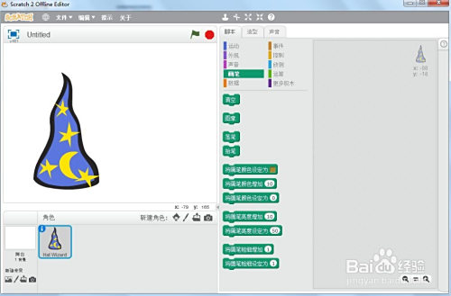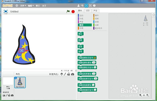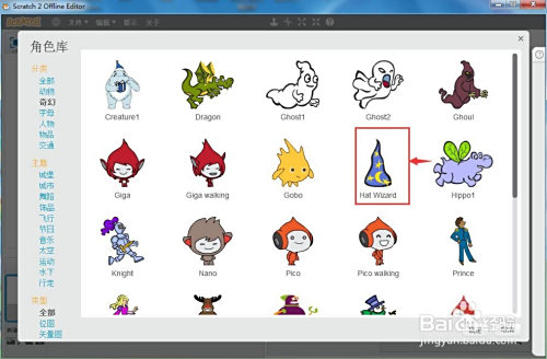 进入scratch2.0的脚色库中,在奇幻类别找到并点击魔术帽,按确定;