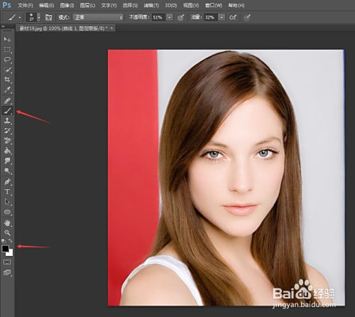 可是整张图片显得有点昏黄,所以这时辰需要用到画笔,把前景色换当作黑色,然后涂抹头发、五官和衣服不消磨皮的处所就行了。