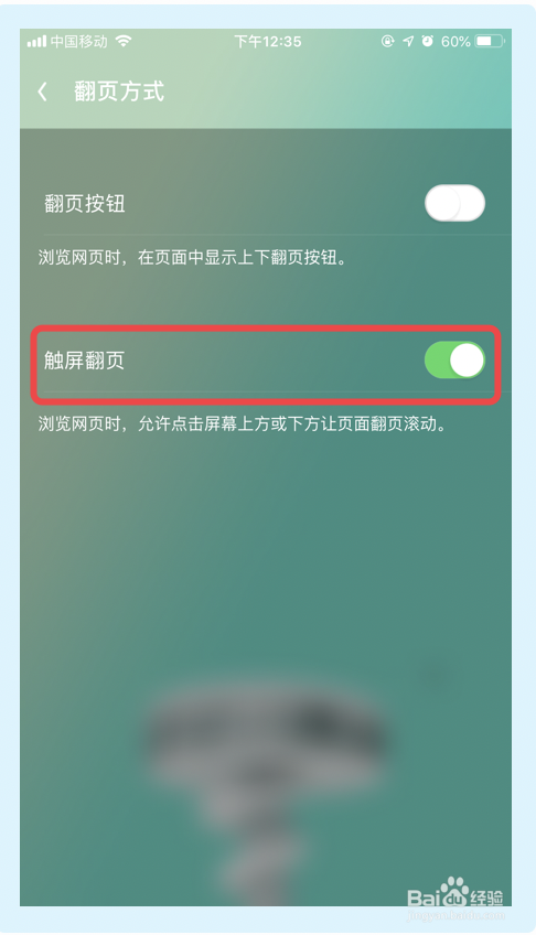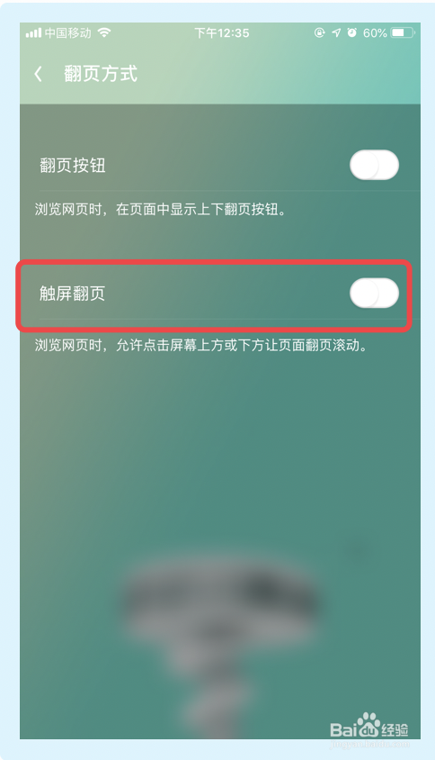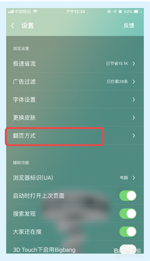 5.点击【触屏翻页】选项,完当作以上步调UC浏览器即可开启触屏翻页功能。