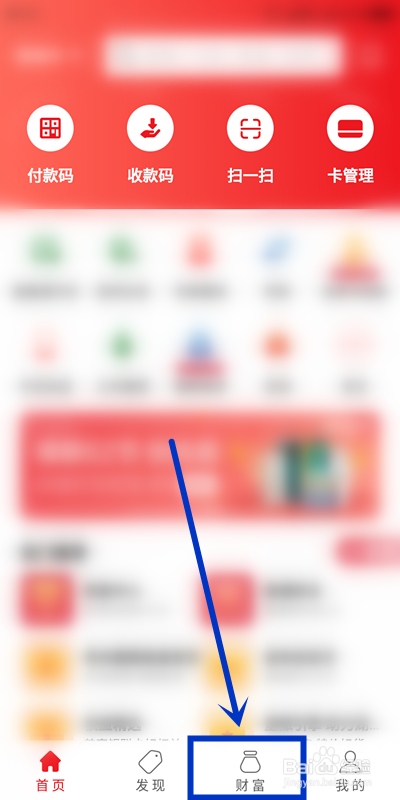 在app首页最下一行,找到并点击【财富】选项卡