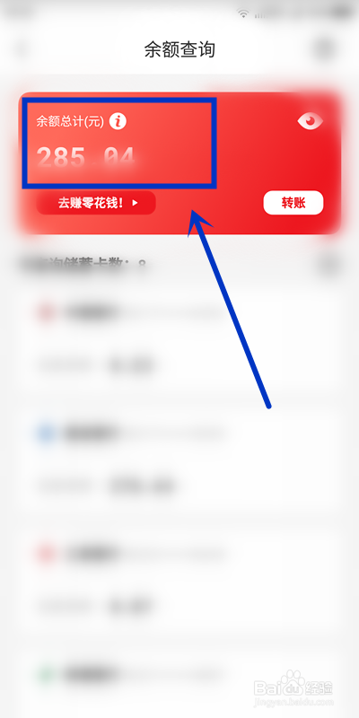 在【余额查询】页面,上面是绑定银行卡的余额总数