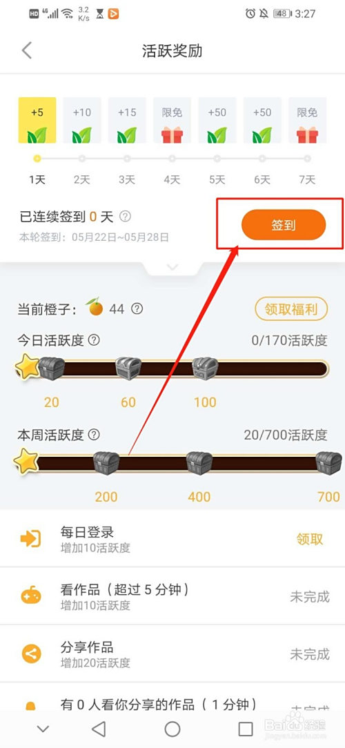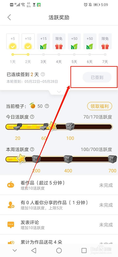 进入“活跃奖励”界面后,点击“签到”,如图。