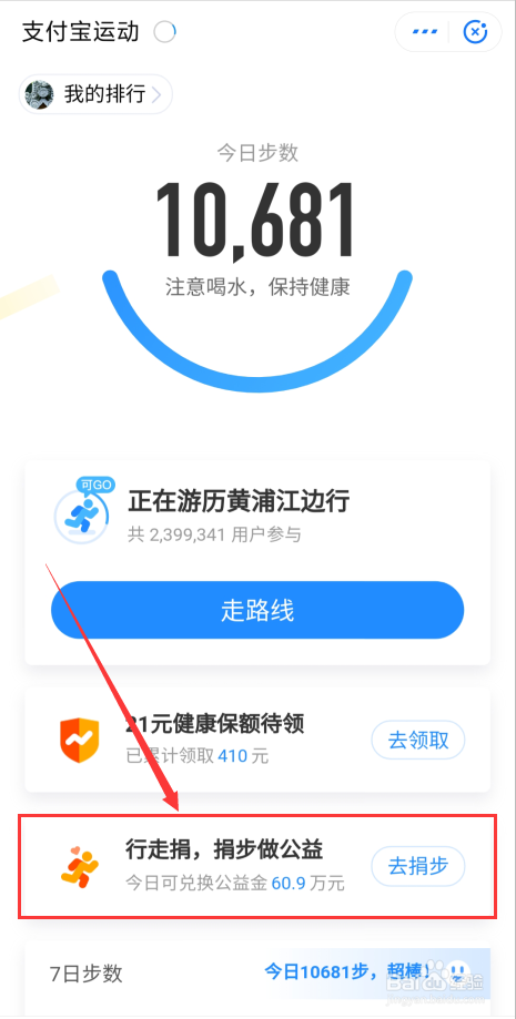 进入“支付宝活动”页面后,点击“去捐步”地点行肆意位置。见下图