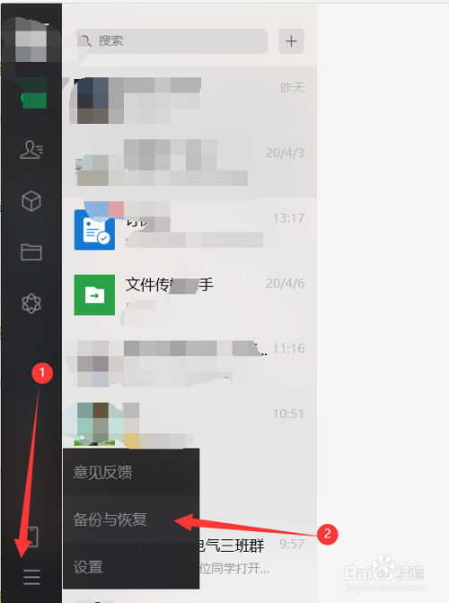 8. 在电脑上微信页面点击左下角“三”合适,接着点击“备份与恢复”,点击“备份聊天记实到电脑”