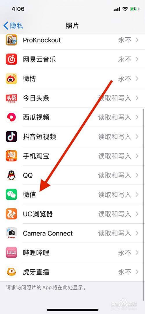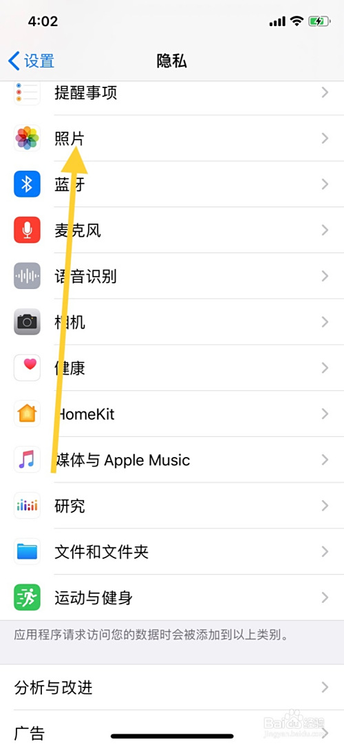 3、点击隐私界面照片。