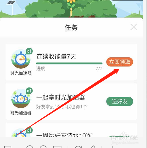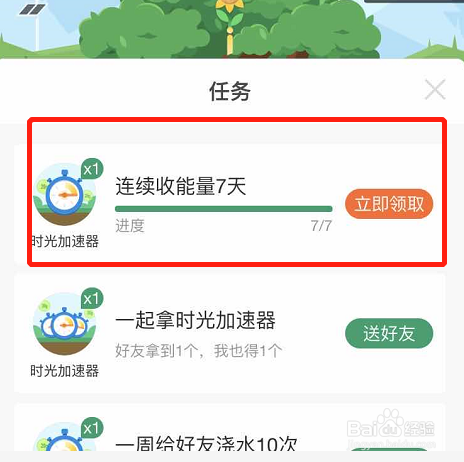 然后就会打开使命弹框,可以看见第一个就是“持续收能量7天”的奖励光阴加快器。