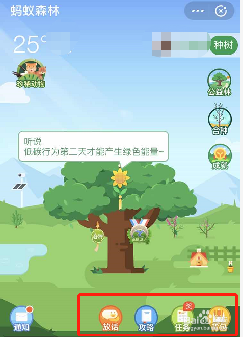 在蚂蚁丛林的应用内,可以在小树苗的下面看见有一排的图标。