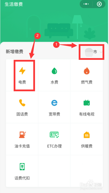 先定位到地点城市,接着点击“电费”