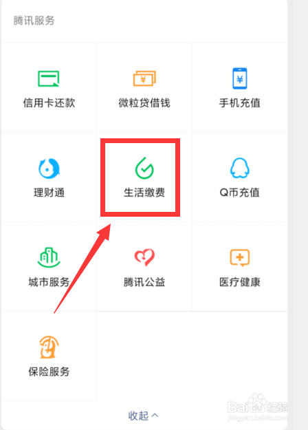 在支付页面找到腾讯办事里的“糊口缴费”点击进入