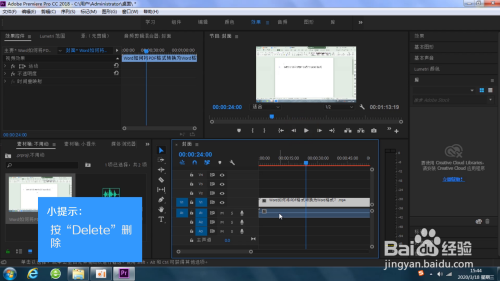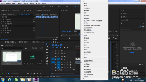 4.先将导入的视频拉到时候线面板中。右键单击,选择“打消链接”。点击下面的音频,按“Delete”删除。