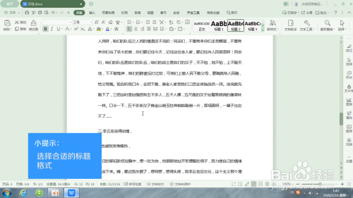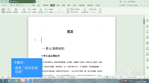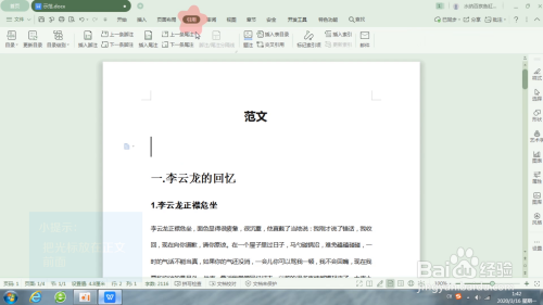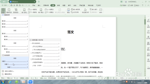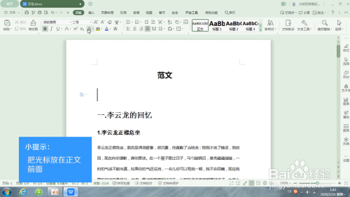 起首我们打开一个文档,可以看到这篇文档有大题目和小题目。以下图“范文”为例,我们把大题目设置为题目1格局,小题目设置为题目2格局。