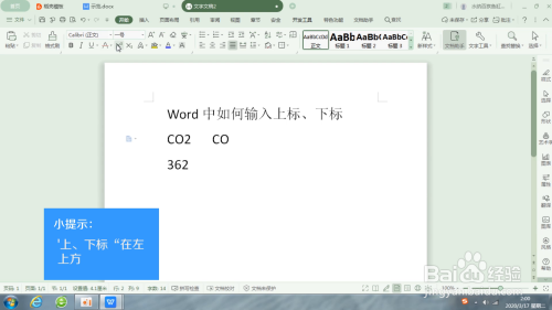 在Word界面点击起头。可以看到上标和下标的功能键。